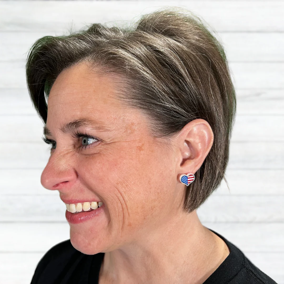 Our American Flag Heart Earrings (Studs) are made with hypoallergenic plastic posts for sensitive ears. These grand ole USA flag earrings are just what you need to show your country pride!