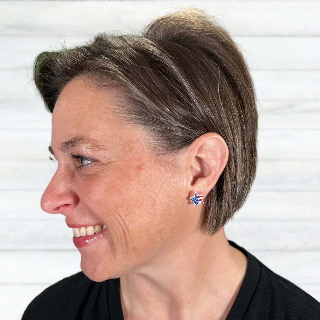 Showcase your American pride with these grand ole American Flag Star Earrings (Studs)! Perfect for any patriot, these earrings won't flag your sensitive ears - they're made with hypoallergenic plastic posts! The only flag you'll be flying will be one of stars and stripes, stylishly!