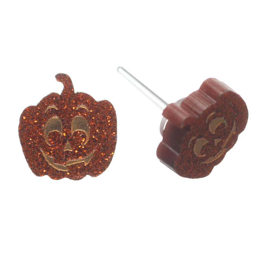 Our Jack-o'-Lantern Earrings (Studs) are made with hypoallergenic plastic posts for sensitive ears. Don't be haunted by irritating metal posts! No tricks here! These plastic posts will treat your BOO-tiful ears right!