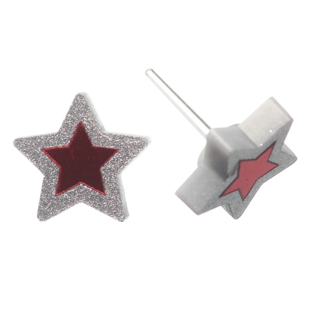 Dazzle with these Patriotic Star Earrings (Studs)! Made with hypoallergenic plastic posts, these glittery gems keep you comfortable all day. Perfect for adding a playful (and patriotic) touch to any outfit. Stars and stripes, meet style and sass!